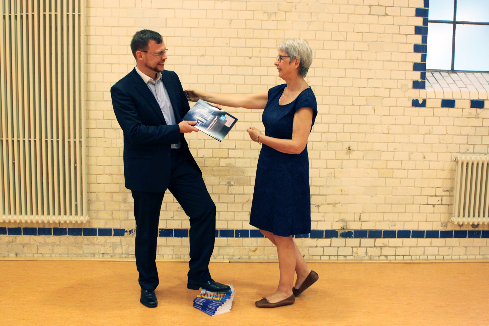 Gudrun Ahlers und Albrecht Wehner haben jahrelang zusammen gearbeitet. Jetzt übergibt sie den Gesundheitsreport an ihn.